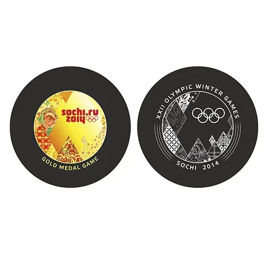 Хоккейная шайба с символикой Зимних Олимпийских игр 2014 года, прошедших в России в городе Сочи.